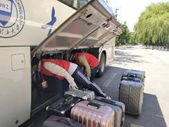 能源1701志愿者崔智鹏带领的后勤保障组主要任务是在2号楼门口帮忙卸载行李、做好分发口罩卫生防护等工作,非常辛苦,他讲到:“或许是同学们开学热情高涨,一大早就陆陆续续有人来,中午这段时间甚至会同时到达两三辆,我们几个人手忙脚乱,看到行李箱很重行动不便的同学,我和小伙伴们会把他们送到宿舍门口,让我比较感动的是同组的一个女生有点身体不适仍在坚持,天气虽然炎热,大家却保持热情,看到每个同学被安排妥当的这种感觉真的很棒!”