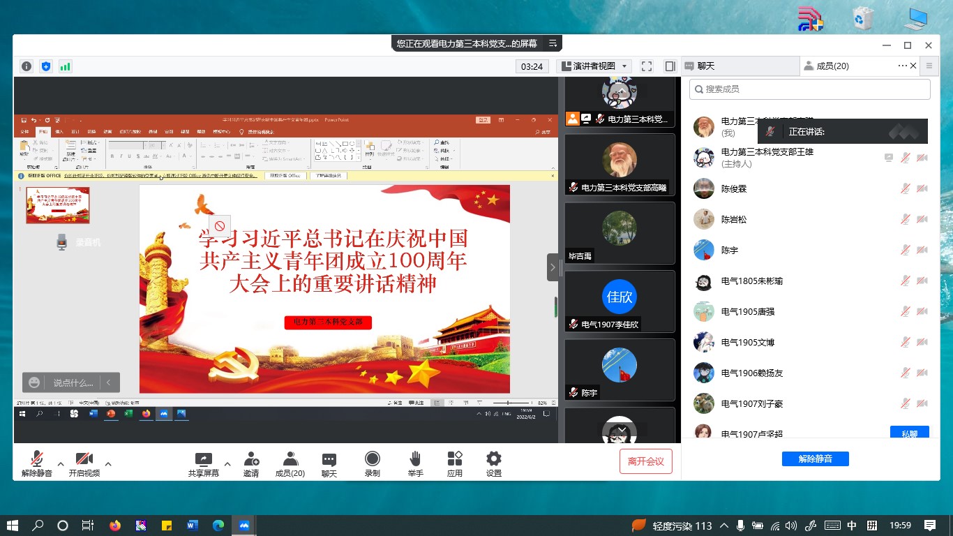 2022年6月4日,电力第三本科的支部组织开展学习习近平总书记在建团100周年大会的讲话精神,集中观看中国共产主义青年团成立100周年大会。会议由支部组织委员主持,全体党员参加。