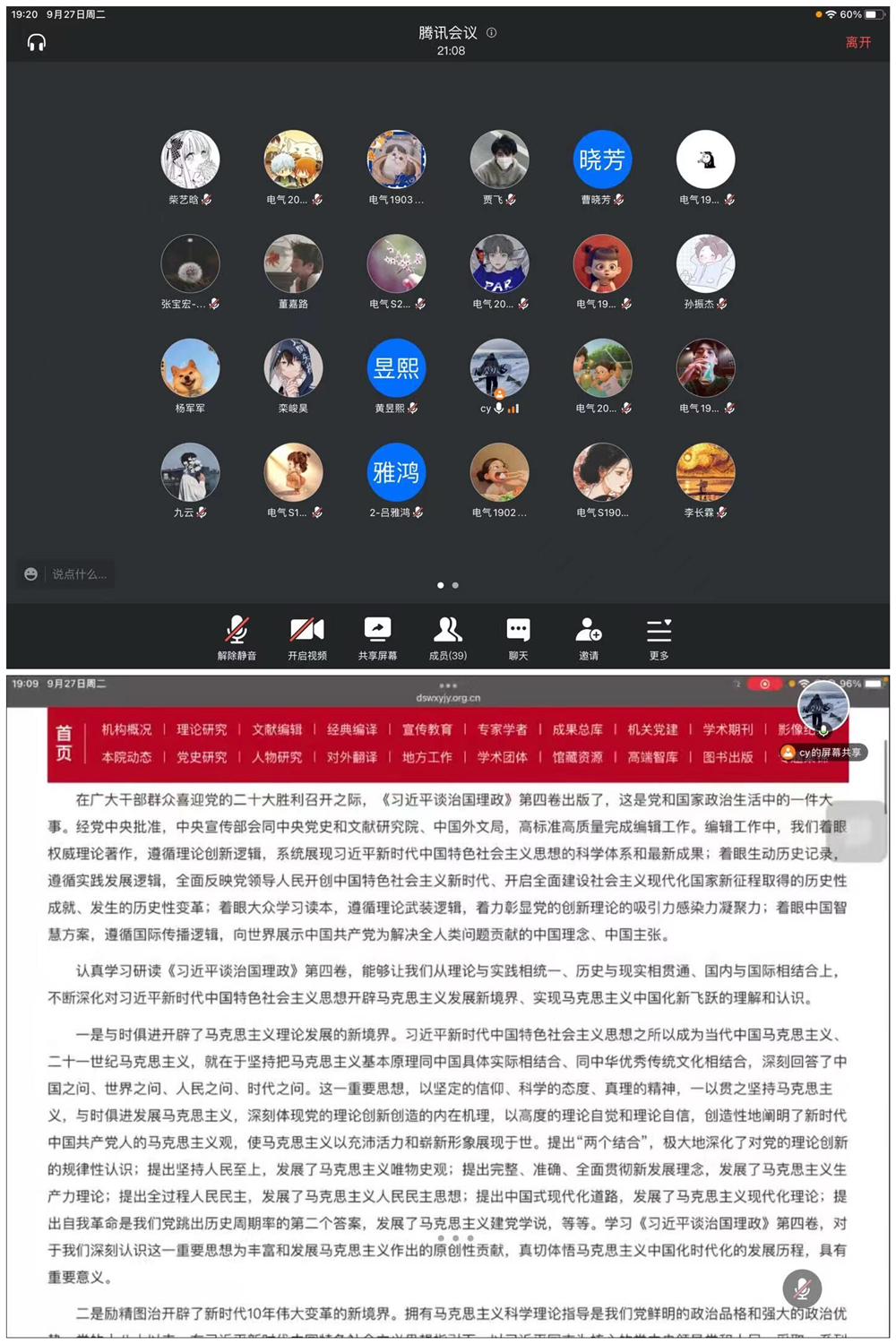 9月28日,电力第二本科党支部进行线上集体学习,专题学习了《习近平谈治国理政》第四卷,交流了学习《习近平谈治国理政》第四卷的心得体会。程远同志主持会议。
