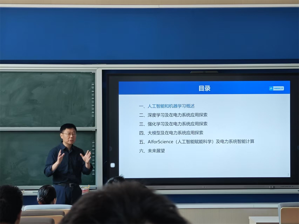 张沛教授从人工智能的基本概念出发,系统介绍了机器学习、深度学习、强化学习及大模型等技术在新型电力系统中的创新应用。他结合团队的最新研究成果,详细阐述了深度学习在光伏发电功率预测、强化学习在配电网负荷转供与动态经济调度中的实践,以及大模型在电力系统调度运行中的潜在价值。此外,张沛教授还分享了“AI for Science”这一前沿方向,探讨了人工智能如何赋能电力系统智能计算,为解决复杂科学问题提供新范式。活动后,实验室负责人韩肖清教授与张沛教授进行了交流,希望双方通过此次报告增进了解,共同助力双方学科建设、人才培养及科研合作等。