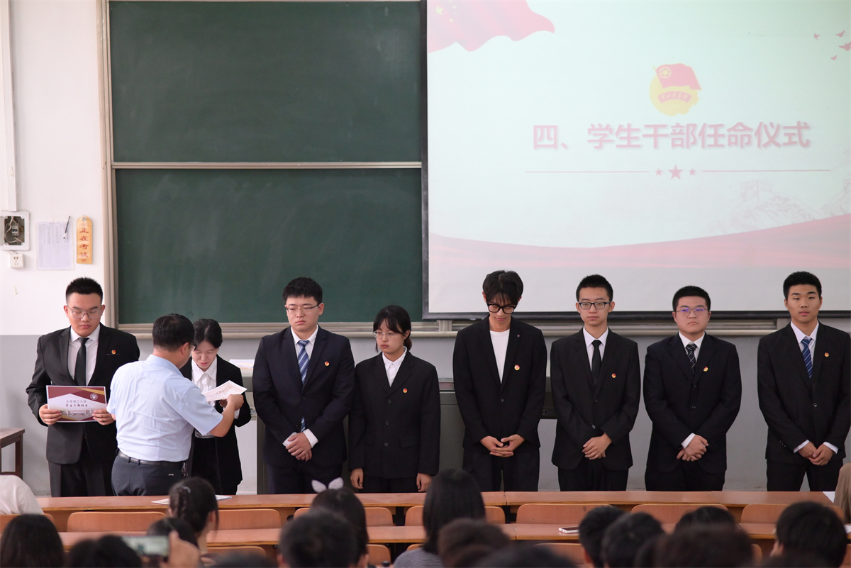 院党委副书记郭春耀回顾了学院往年学生干部工作的骄人成绩,对各位即将上任的学生干部提出了殷切希望,希望各位学生干部坚持不懈、持之以恒、以身作则,在以后的学习与工作之路上走的更稳更远。随后,郭春耀副书记宣读了对刘源等9名主要学生干部的任命文件,并依次为他们颁发学生干部聘书,合影留念。