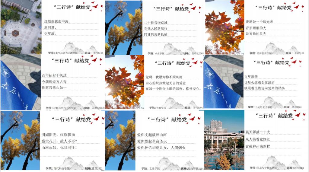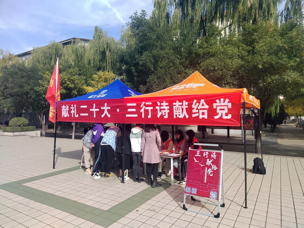 为了庆祝中国共产党第二十次全国代表大会胜利召开,激励和动员同学们为实现“两个一百年”奋斗目标、实现中华民族伟大复兴的中国梦凝聚起青春力量,Beat365官网组织开展了“踔厉奋发,强国有我”献礼党的二十大“三行诗献给党”、“经典诵读献给党”、“创意海报献给党”、“师生祝福献给党”等系列活动。