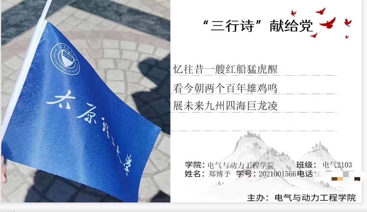 三行诗,诗短情长。本次“三行诗献给党”主题征集活动上线仅一周,全网阅读量即突破十万人次,投稿作品字词凝练简介,句句真情流露,展现了太理学子“听党话,跟党走”的坚定信念,积极向上的风采、只争朝夕的干劲和勇挑时代重任的担当,以斗志昂扬的精神面貌庆祝党的二十大胜利召开!