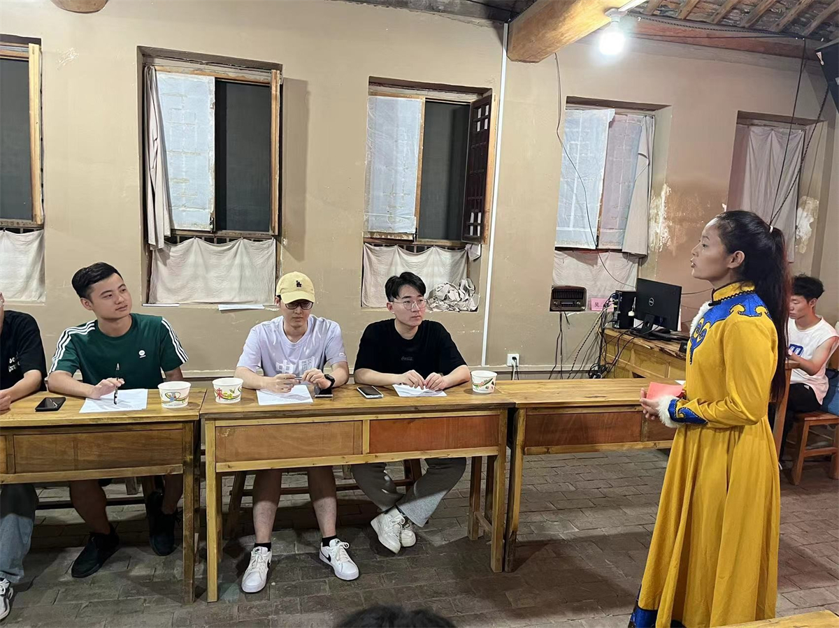 期间,实践队队员联合呼伦贝尔学院聚办了一场“铸牢中华民族共同体意识,高校联合推普振兴乡村计划”座谈会,出席座谈会的有双方实践队员和带队指导老师。在座谈会上,主持人先是提问了“少数民族发展与中华民族的未来有什么关系”,实践队员罗颛键回答到,少数民族与中华民族的关系是“一荣俱荣”,唯有少数民族的发展得到充分保障,才能在整体上加快中华民族的发展,从而构建美好的未来,其次又讲到关于文化多样性的方面,少数民族中的风采习俗,语言服饰都极大的扩充了中华民族的文化宝库,是中华民族不可缺失的文化瑰宝。接下来的互动讨论环节,大家针对普通话在少数民族地区的传播情况进行了讨论。关于 “推普活动是否会在少数民族地区受到一定限度的排斥?”的问题,呼伦贝尔学院的一名同学回答说 “不会的,少数民族和汉族一样,都有着深切的民族团结意识,在与时俱进的今天,少数民族会积极学习普通话,同时也会继续发扬和传承本民族的文化特色。”随后,实践队员继续针对 “在今天,少数民族的语言和文字在哪些场合会用的更多”等问题展开了探讨。在此次座谈会中,呼伦贝尔学院的同学还介绍了少数民族的一些风俗习惯,包括关于马头琴、蒙古包、民族服饰的一些内容,并邀请了全部的实践队员品尝了他们自己熬制的奶茶,队员们真切地感受到了呼伦贝尔学院同学的热情,和各民族青年为民族团结和中华民族伟大复兴的伟业而团结奋斗的信心。