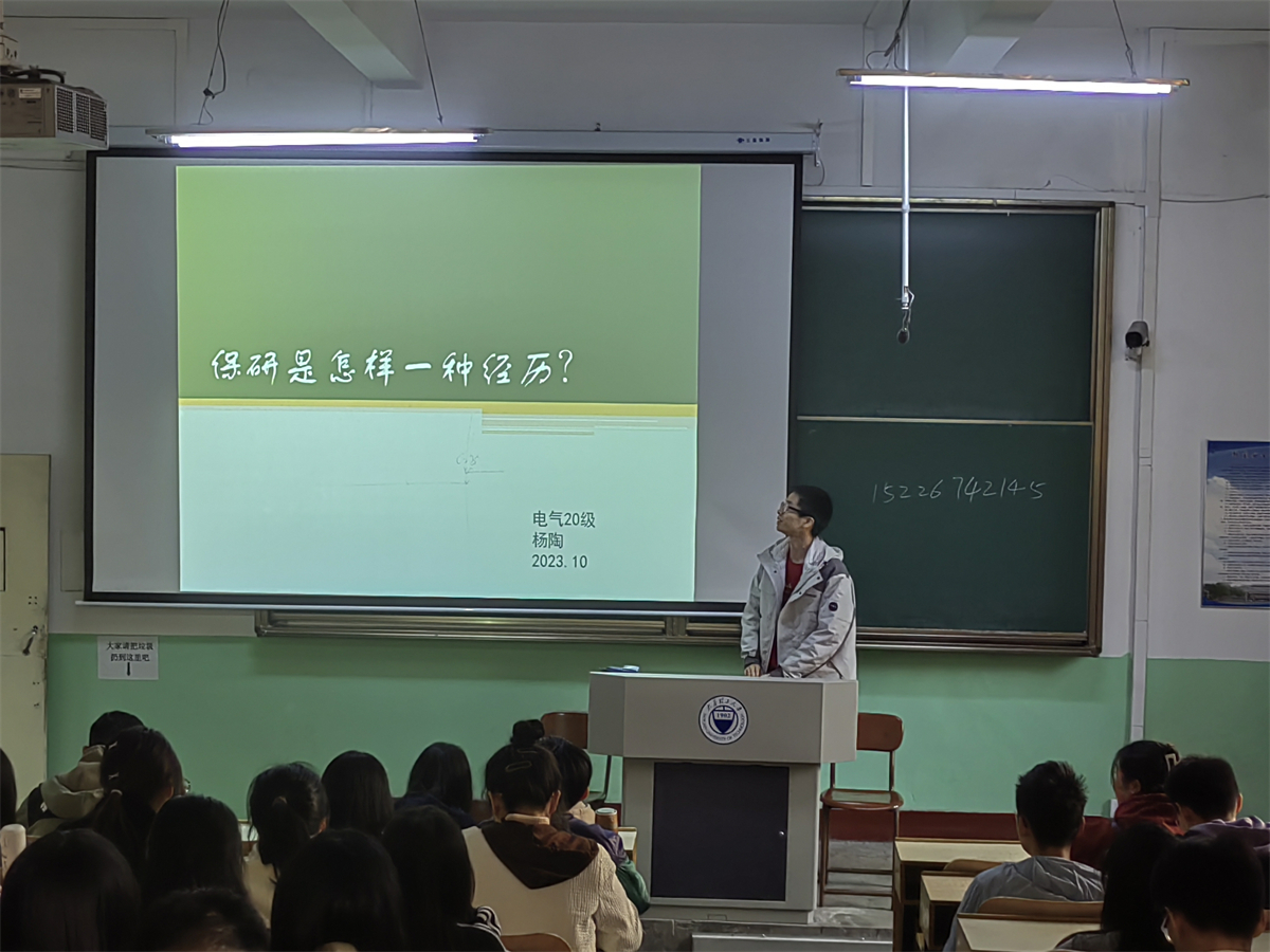 自动化2006班的张柏珵先后获得过2021年度中国工商银行奖学金和2022年度“金力”奖学金,在互联网+、挑战杯、全国大学生机械创新设计大赛、中国机器人及人工智能大赛、中国高校智能机器人创意大赛、中国计算机设计大赛等多项学科竞赛中荣获11项国家级奖项,鼓励各位同学明确发展方向,找准兴趣点,然后在这个领域持续深耕;电气2008班的杨陶曾获西门子杯全国特等奖、数学建模山西一等奖、电工杯全国二等奖,科研项目有山西省大学生创新训练计划《ZrO2“晶格氧”循环对Ni基催化CO2活化机制》和两项实用新型专利,他分享了在保研申请材料方面的经验,他说到升学深造是一个比较漫长的过程,需要持续不断的努力。此外分享的还有能源2001马新月、能源2002张奕捷、自动化2002张瑜、电气2007巩凡逸。