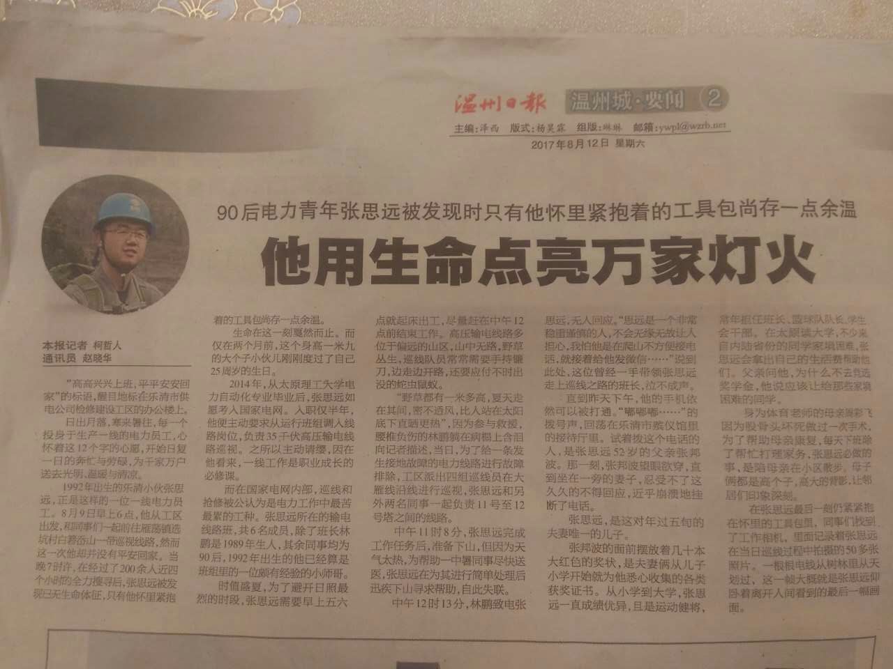 张思远校友因公殉职的消息短短几天内就在浙江乃至全国形成了广泛影响,浙江卫视新闻联播、浙江日报、乐清电视台等众多媒体均已“90后电力巡线员张思远,用生命点亮万家灯火”等为名进行了专题报道,社会各界自发开展对张思远校友的悼念和学习活动。得知张思远因公殉职的消息,全校师生深感悲痛,学校立即组织慰问组前往追思校友、慰问家属,慰问活动也得到浙江和温州校友会的积极响应和协助。Beat365官方网站一行五人抵达浙江乐清后,首先看望张思远校友的父母。张思远校友的父母十分感动,特别感谢学校对张思远的悉心培养和家人般的关心。慰问组表达了全校师生对张思远校友的哀思,张思远校友生命虽然短暂,工作岗位虽然平凡,但他成就了不平凡的人生,值得所有人纪念和学习,学校以有张思远这样优秀的校友而骄傲。希望家属保重身体,有困难和学校说,学校会尽力帮助解决。慰问组与张思远生前工作的乐清市供电公司及其上级单位温州市供电公司领导进行了会谈,交流了张思远在校期间、入职三年的综合表现,张思远所在单位领导对其入职后的工作态度、工作素质、工作能力等方面做了高度评价,感谢Beat365官网为他们输送了像张思远校友这样优秀的员工,对Beat365官网人才培养的质量以及关心校友发展的理念给予了肯定。在乐清期间,慰问组参加了张思远校友的追悼会和遗体告别仪式,前往张思远生前所在工区,深入了解张思远校友工作情况,并与张思远校友在校期间的同班同学代表和同事们共同追思张思远校友的生前事迹。