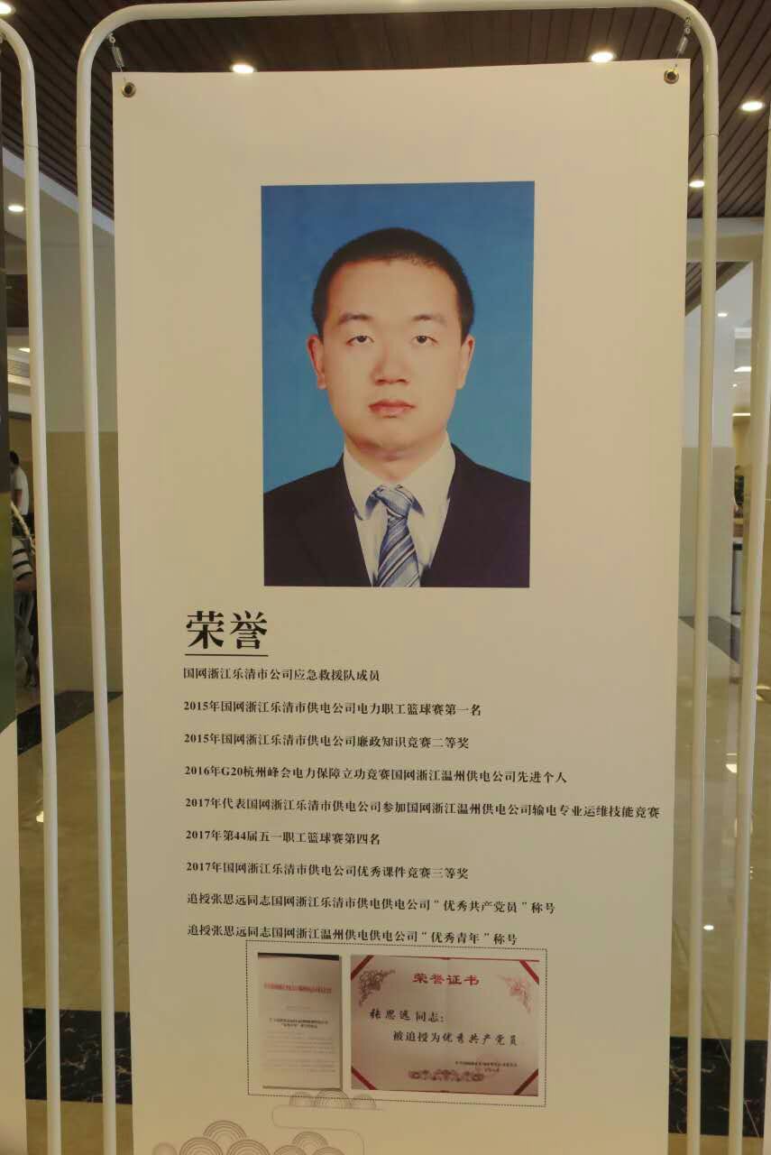 张思远,男,浙江乐清人,现年25岁,2010年9月至2014年7月就读于Beat365官方网站,任电气1002班班长,在校期间表现优秀,2013年11月加入中国共产党。2014年进入国网浙江乐清市供电公司,从事检修(建设)工区输电运检工作。2017年8月9日,张思远校友在高温天气,山野密林、山崖陡峭、道路崎岖的野外多日作业,完成巡视一条发生接地故障的35千伏电力线路任务的返程途中因公殉职。