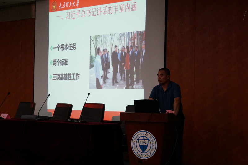 赵惠民围绕习近平总书记在北京大学师生座谈会上重要讲话的丰富内涵和精神实质,结合习近平总书记在纪念马克思诞辰200周年大会上的重要讲话精神,从“把立德树人作为检验一切工作的根本标准”“马克思主义是中国大学最鲜亮的底色”“做新时代四好老师”“做担负民族复兴大任的时代新人”等四个部分,为广大师生详细解读了习近平总书记重要讲话的重要内涵。