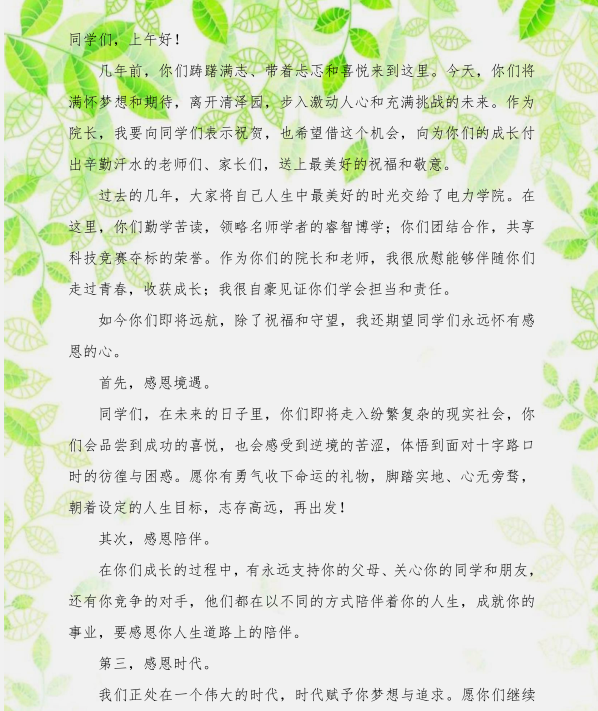 2019年电力学院毕业典礼院长致辞--学会担当 扛起责任