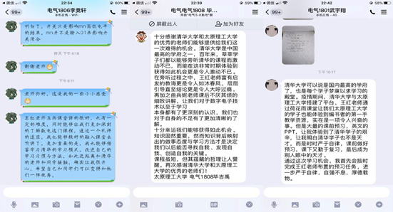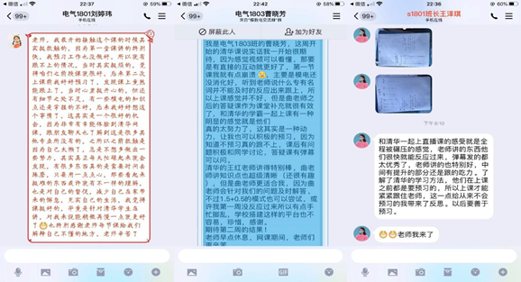 电气1801班刘婷玮同学就说:“我刚开始接触这个课的时候,其实是挺抵触的,因为第一堂课讲的特别快,我预习工作没做好,所以就有跟不上的情况,当时其实挺烦的。后来第二次课上课前好好预习,发现课上竟然能跟上了,当时心里挺开心的。后来好好想想这个事情,这其实是一个很好的机会,因为非常有幸能体验到清华网课,跟朋友聊天也了解到这是很多专业所没有的,之前所以抵触是因为自己太懒了,总是不想多做一些努力”。