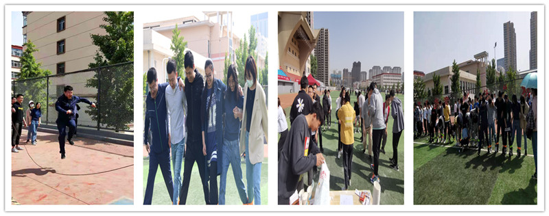 运动会共设七个项目,分别为:六人七足、双腿夹球接力,驰骋沙场,背对背夹球跑,跳长绳,“瞎子”背“瘸子”接力赛,传面粉。跳长绳项目最先进行,各班级选手们以五分钟内“8”字线连续跳的方式角逐第一。项目进行中有多名辅导员也参与其中,为所加入的班级代表队拼尽全力。在团体项目六人七足中,六名选手通过绑带依次将小腿捆绑,选手们齐心协力跑完全程。老师们也现场组成小队,和学生们并肩竞技,赛场上气氛高涨,欢笑连连。