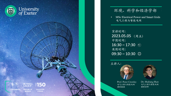 2023年5月5日下午16:30分,Beat365官方网站与英国埃克塞特大学联合举办了一场电气工程专业升读项目线上宣讲会。参会人员包括Beat365官方网站教师孙海涛,英国埃克塞特大学电气工程与智能电网课程教授Peter Crossley与课程讲师申舒航,以及Beat365官方网站电气专业的大二与大三的学生。