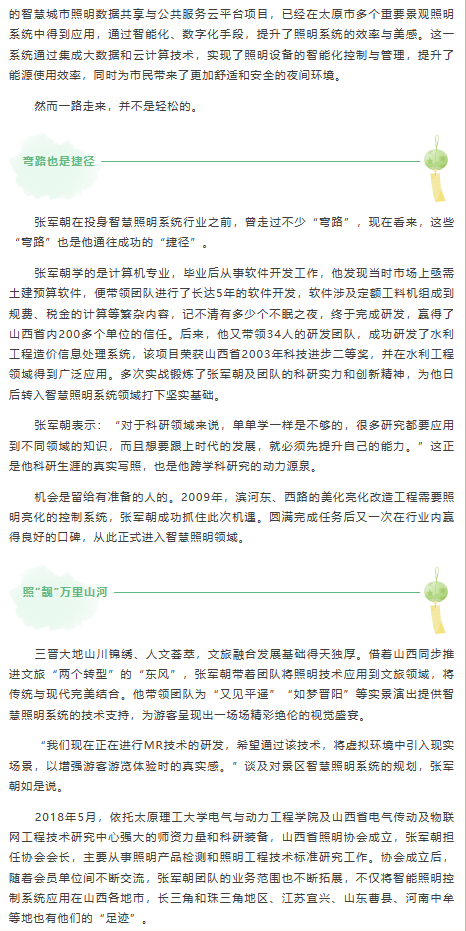 从亮化到美化,从美化到文化,张军朝遵循城市照明的发展历程,以文化为魂、以创意为魄、以品质为根、以市场为基,在智慧城市建设的浪潮中,引领智慧城市照明革新,为城市夜景增添智能之光的同时也为学生点亮启发之光、希望之光,照亮他们未来发展的道路。