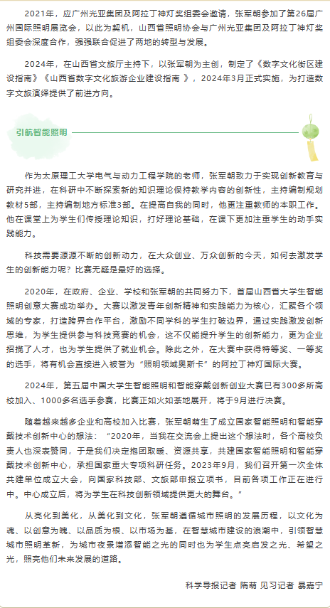2020年,在政府、企业、学校和张军朝的共同努力下,首届山西省大学生智能照明创意大赛成功举办。大赛以激发青年创新精神和实践能力为核心,汇聚各个领域的专家,打造跨界合作平台,激励不同学科的学生打破边界,通过实践激发创新思维,为学生提供参与科技竞赛的机会,这不仅能提升学生的创新能力,更为企业招揽了人才,也为学生提供了就业机会。除此之外,在大赛中获得特等奖、一等奖的选手,将有机会直接进入被誉为“照明领域奥斯卡”的阿拉丁神灯国际大赛。