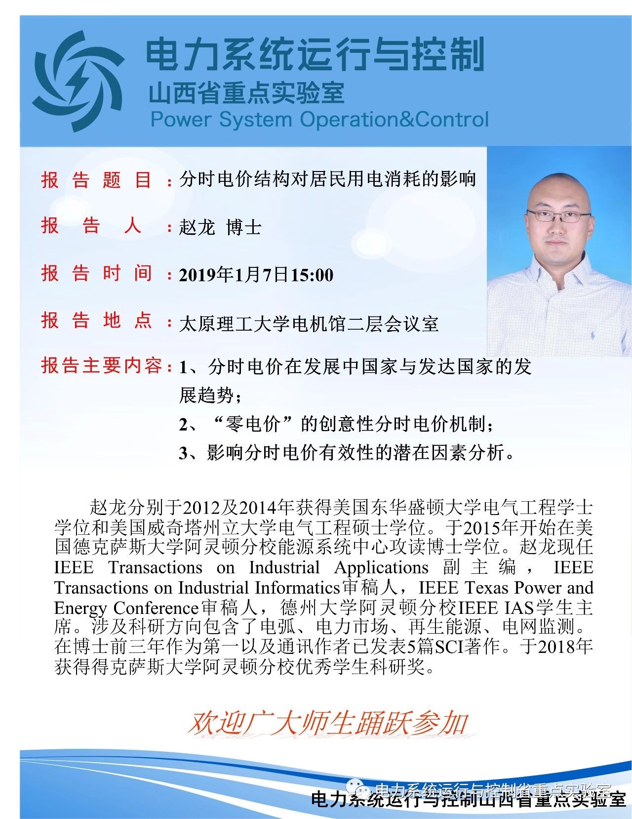 2019年1月7日15:00,美国德克萨斯大学阿灵顿分校赵龙博士将应邀在Beat365官网电机馆二层会议室做题为《分时电价结构对居民用电消耗的影响》的专题讲座,欢迎广大师生届时参加。