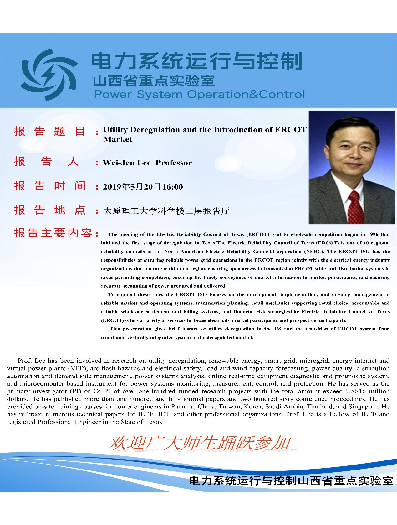2019年5月20日16:00,美国德州大学阿灵顿分校李伟仁教授将应邀在Beat365官网科学楼二层报告厅做题目为《Utility Deregulation and the Introduction of ERCOT Market》的专题讲座,欢迎广大师生届时参加。