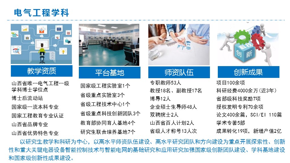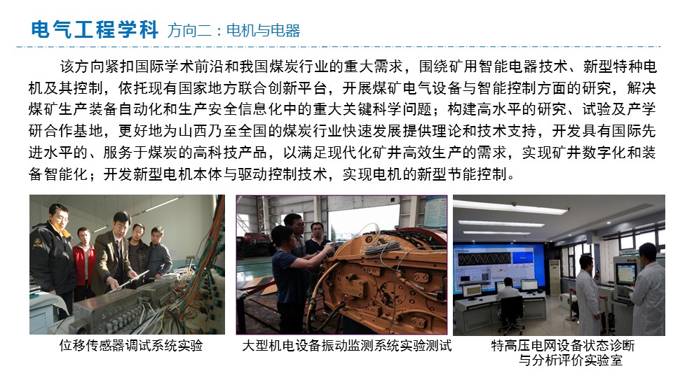 学院学科设置齐全、师资力量雄厚、人才培养卓越、科研实力强劲、国际交流活跃。拥有电气工程一级学科博士点和博士后流动站,动力工程及工程热物理、控制科学与工程一级学科硕士点。拥有国务院特殊津贴专家2人,双聘院士3人,国家级教学名师1人,国家有突出贡献中青年专家1人,全国“五一劳动奖章”获得者、全国模范教师各1名,以及各类省级人才称号获得者25人次。拥有国家杰青、长江等国家级人才2名。拥有煤电清洁智能控制教育部重点实验室、“能源互联网”111学科引智基地、矿用智能电器技术国家地方联合实验室等国家、省部级重点实验室和研究中心14个。